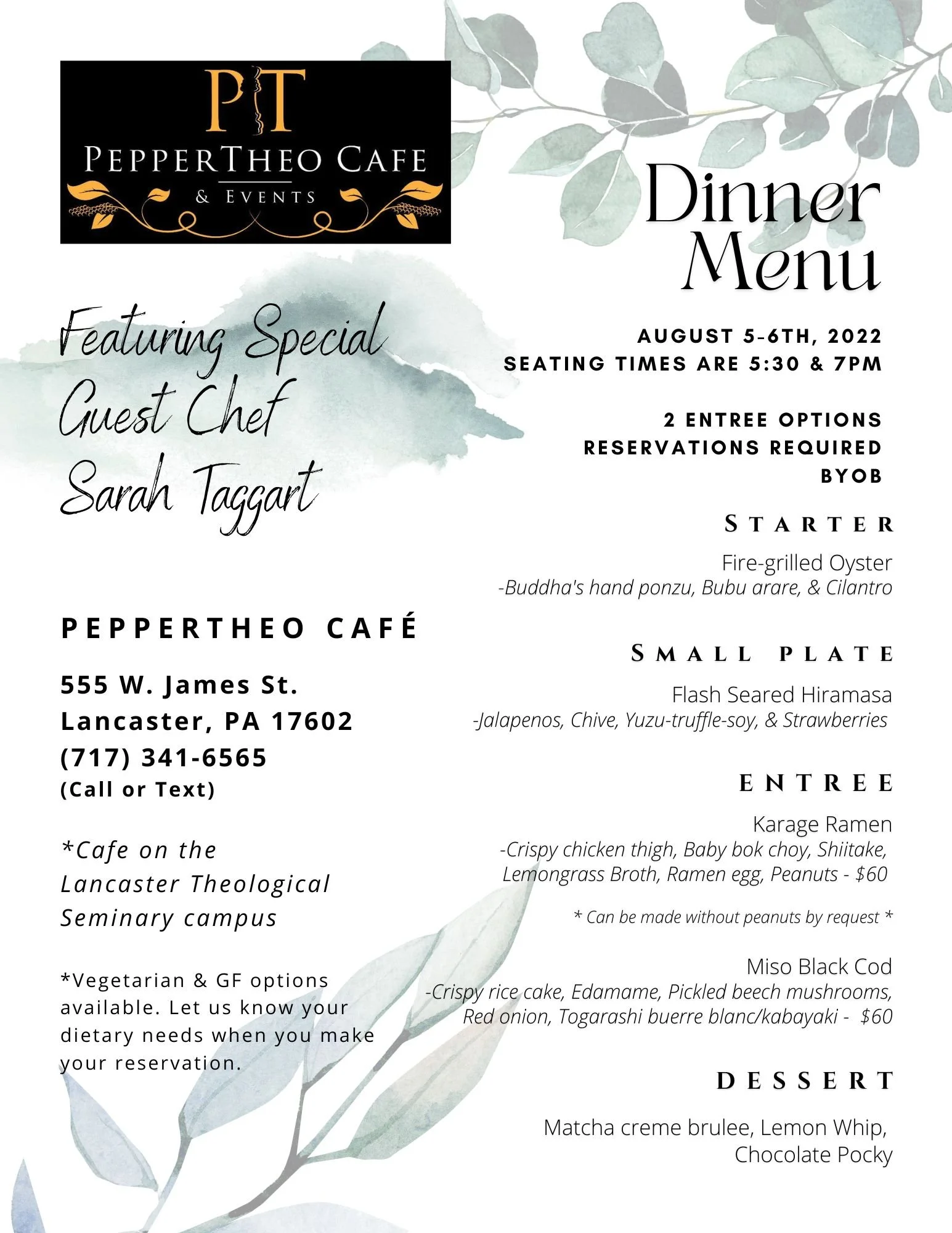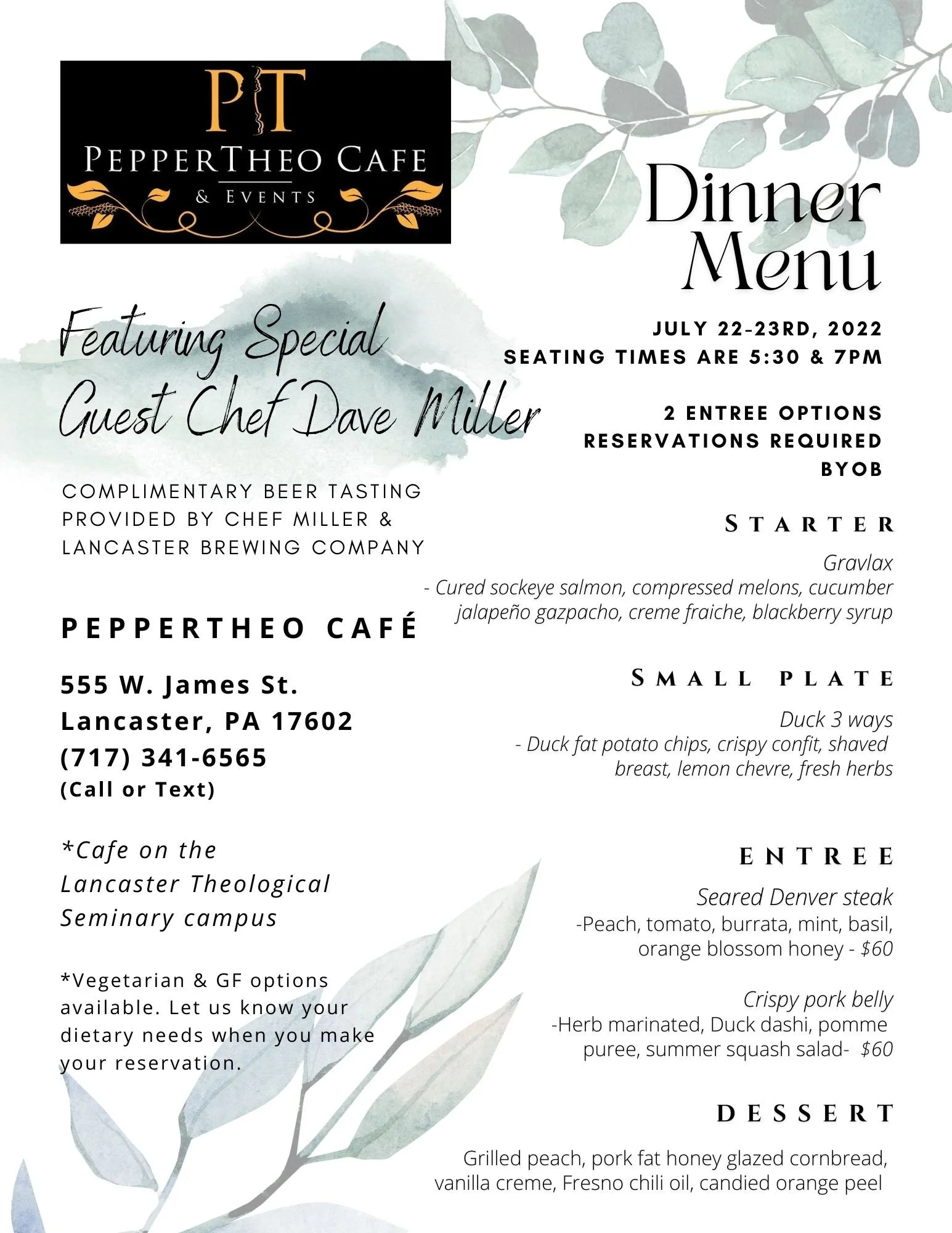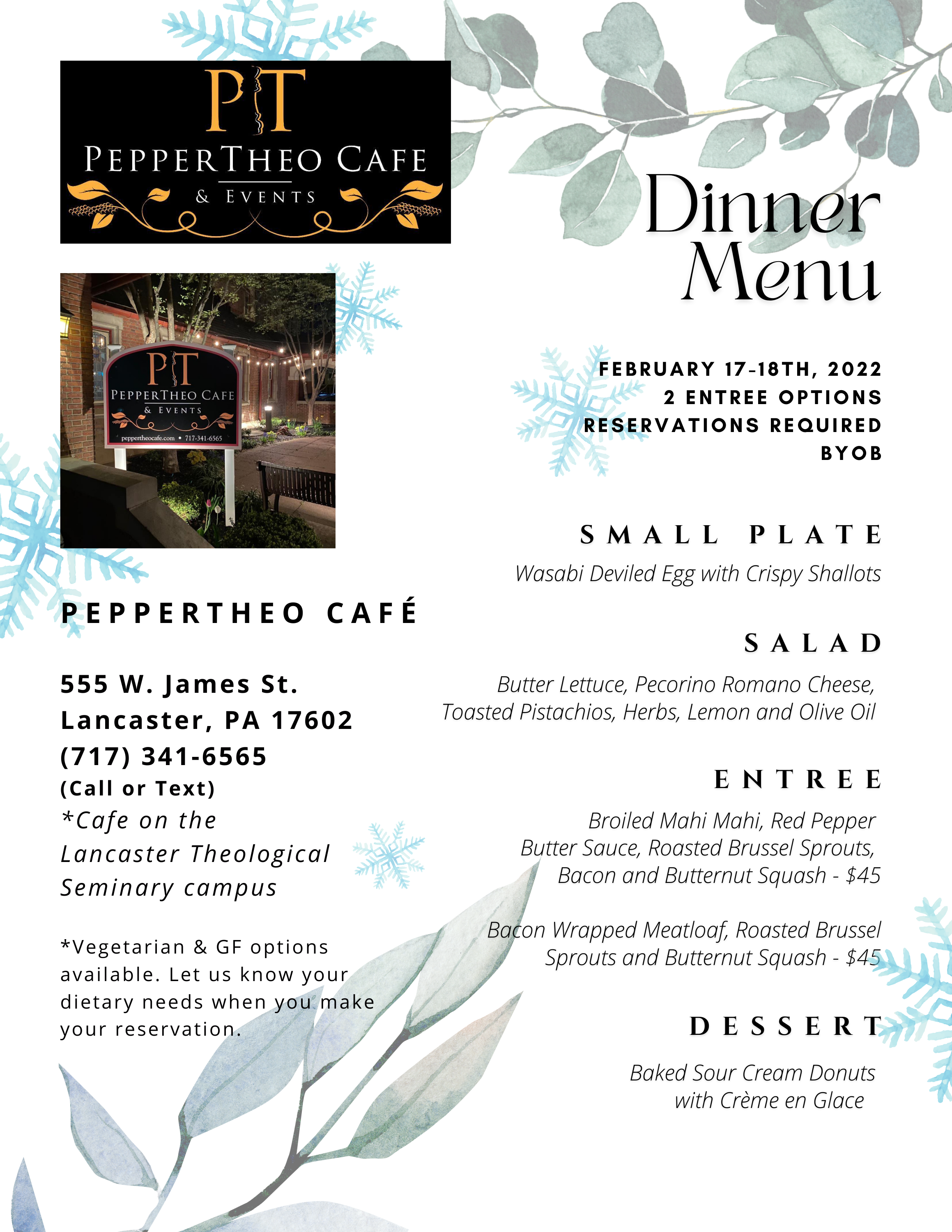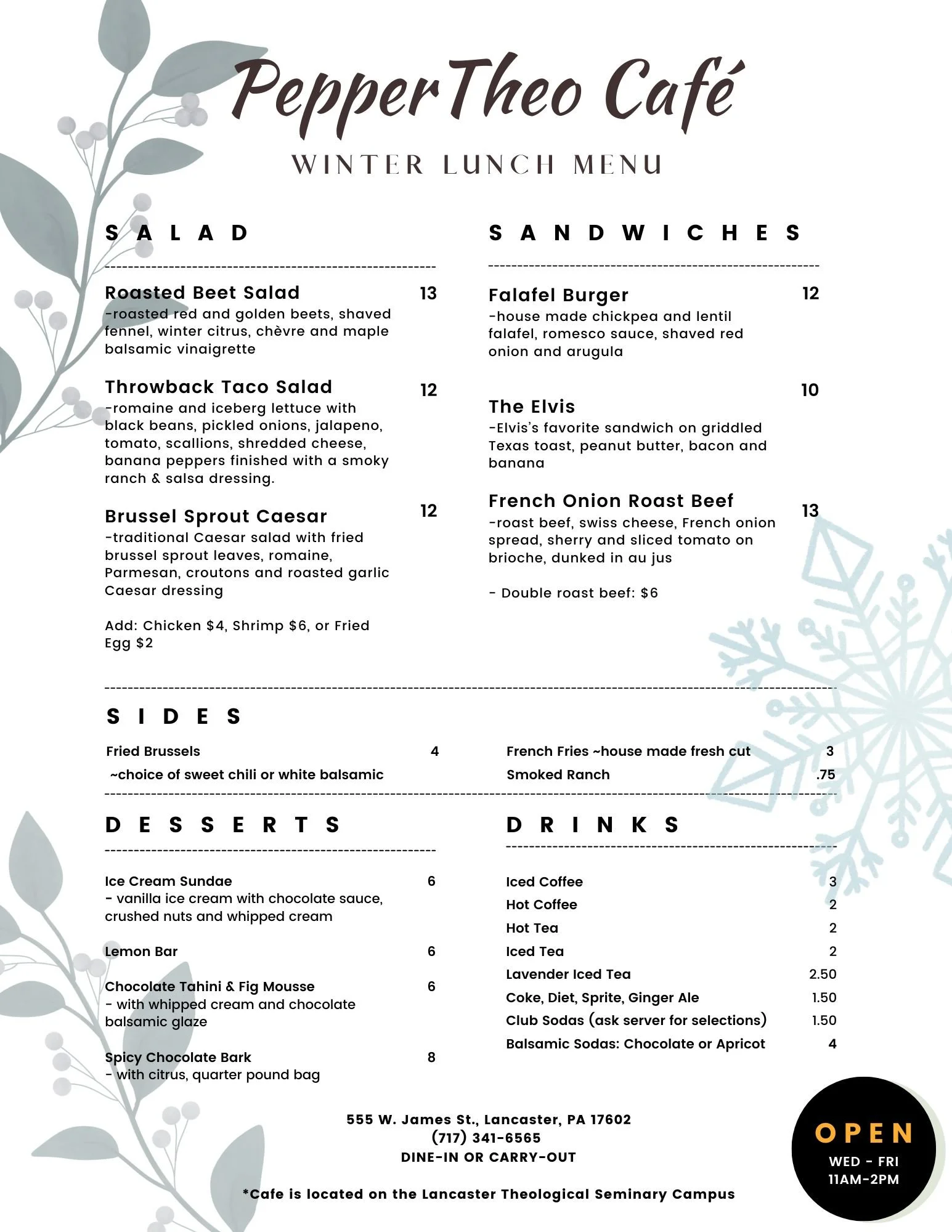Lunch and Dinner Service is not currently being offered at Pepper Theo Cafe. Stay up to date with us on Instagram and Facebook! Previous Menus View fullsize View fullsize View fullsize View fullsize View fullsize View fullsize View fullsize View fullsize View fullsize View fullsize View fullsize View fullsize View fullsize
