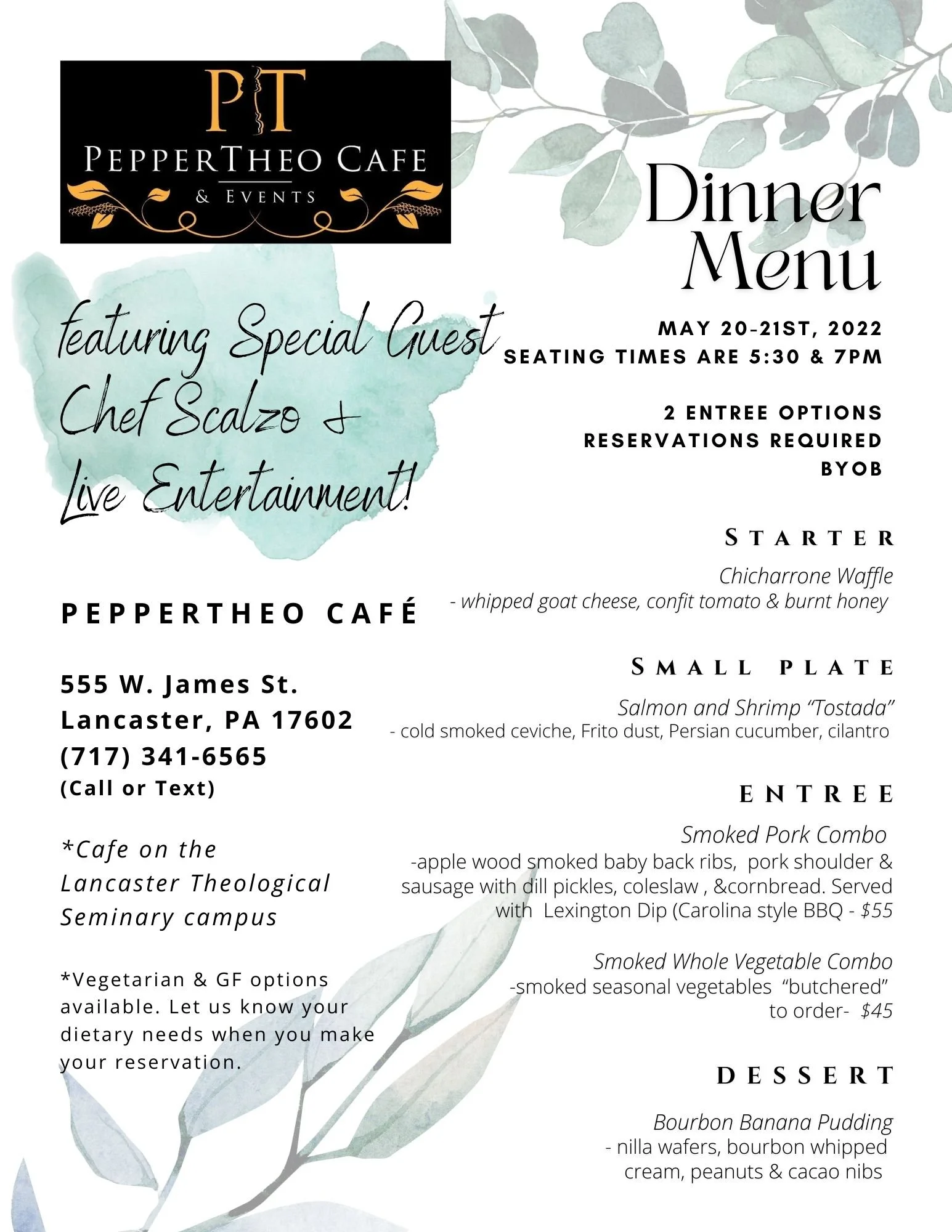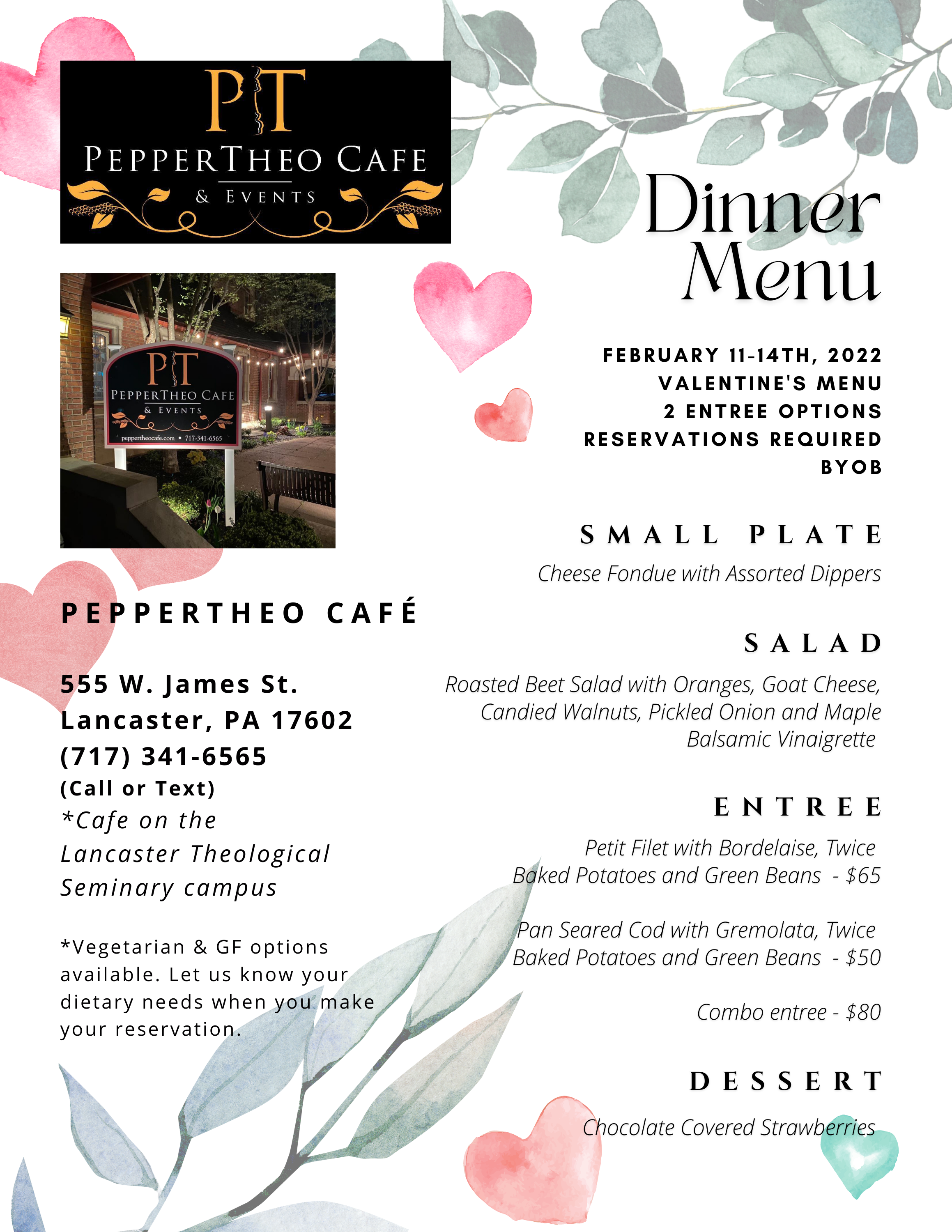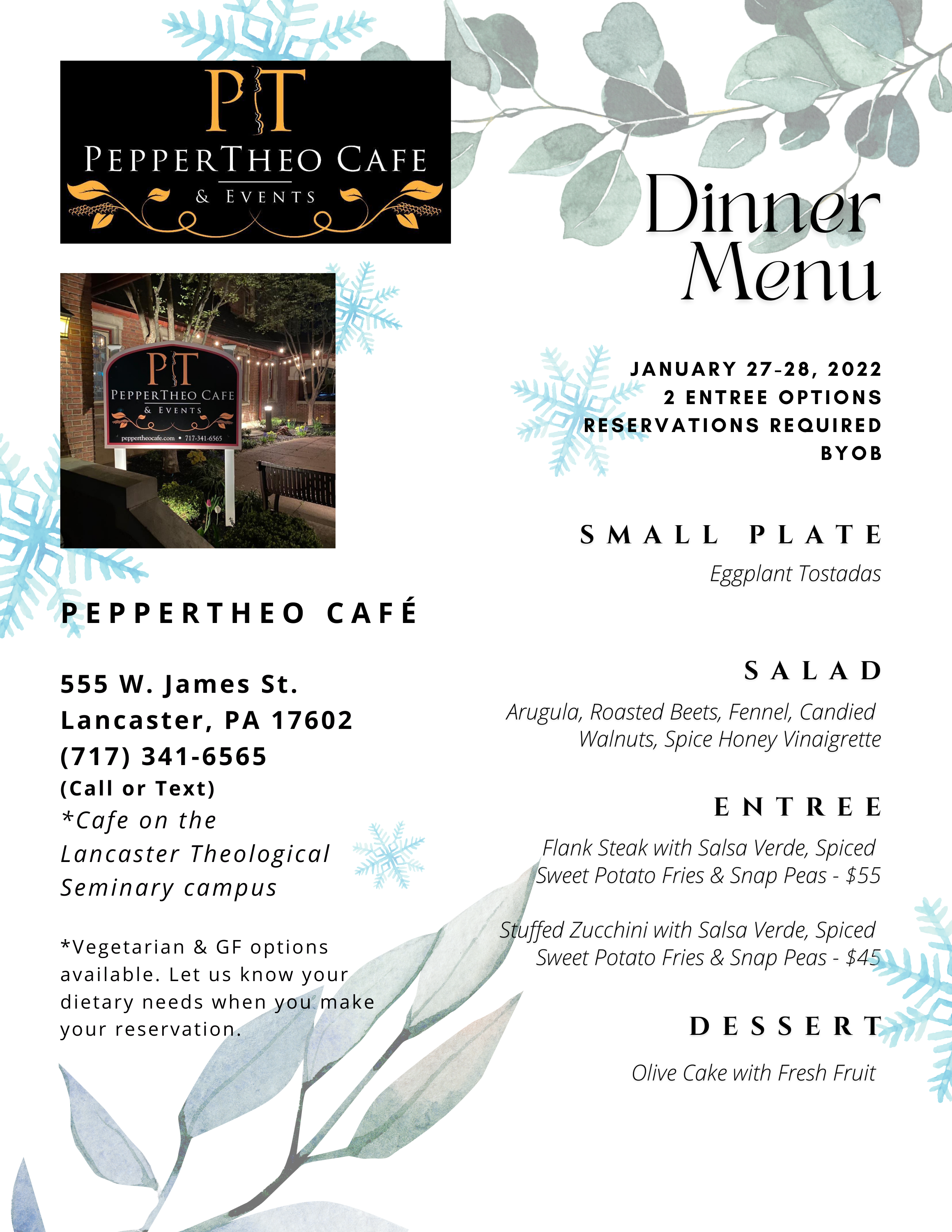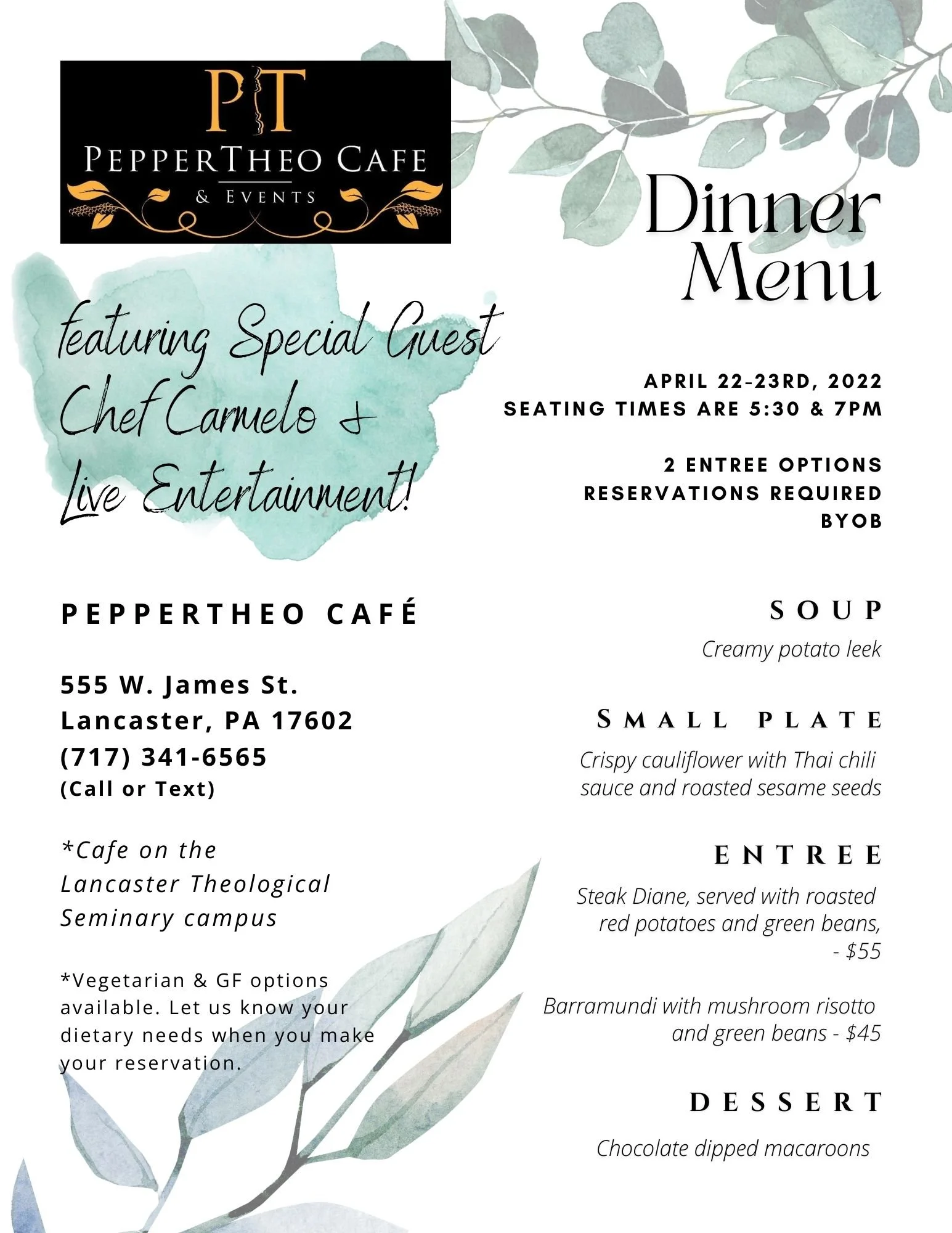 Lunch and Dinner Service is not currently being offered at Pepper Theo Cafe. Stay up to date with us on Instagram and Facebook! Previous Menus View fullsize View fullsize View fullsize View fullsize View fullsize View fullsize View fullsize View fullsize View fullsize View fullsize View fullsize View fullsize View fullsize